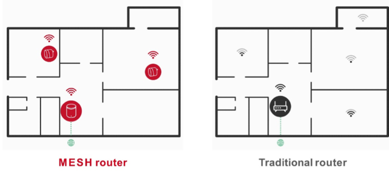 Opposite to traditional router which use to connect each independent device, mesh primary node will connect to the other nodes in the same network and provide enough frequency to each of them if they are all connected within a range and then each user device will get the frequency from the nearest available node who can serve better.